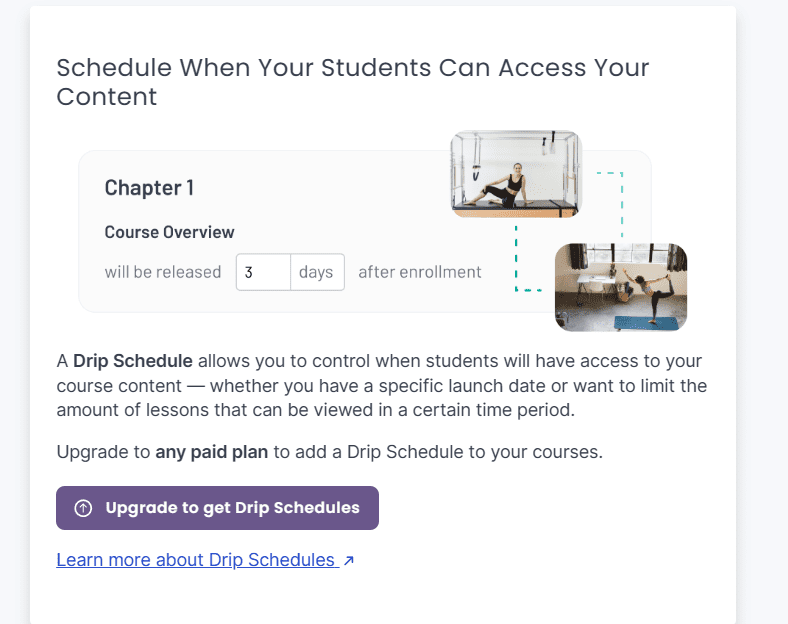 W zakładce „Drip” znajdziesz ustawienia dotyczące częstotliwości dostępu do nowych materiałów kursu. Możesz ustawić w jakich odstępach czasowych użytkownik otrzyma kolejną lekcję. Będzie to zwykle przydatne, gdy oferujesz subskrypcyjny model płatności. Wówczas możesz udostępniać każdą lekcję na przykład co tydzień.