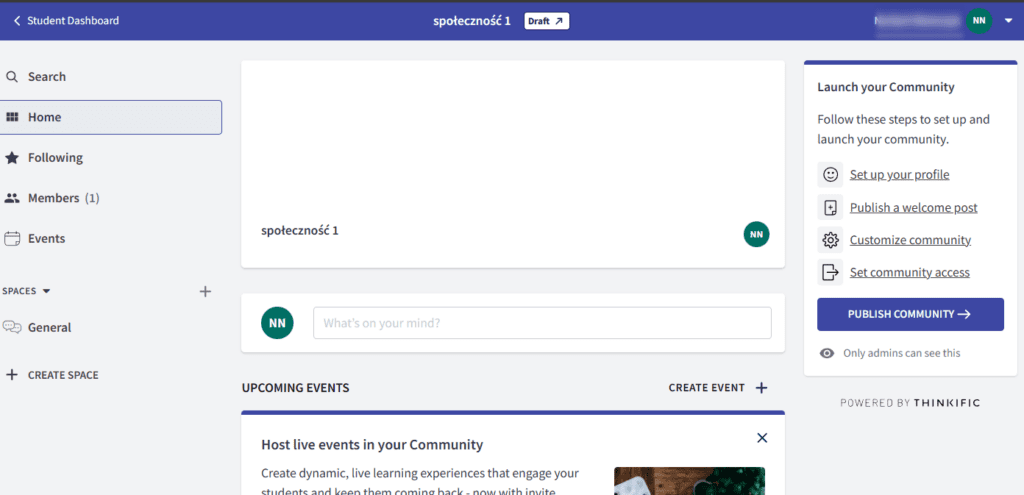 Pomyśl o tym jako o grupie na Facebooku. Różnica jest jednak taka, że opcje społecznościowe w Thinkific są dużo bardziej zaawansowane.