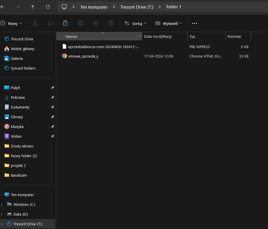 Dzięki temu jeżeli będziesz chcieć przenieść do chmury jakiś plik, nie musisz logować się na swoje konto Tresorit, tylko przenieść plik na utworzony dysk T, czyli Tresorit Drive.