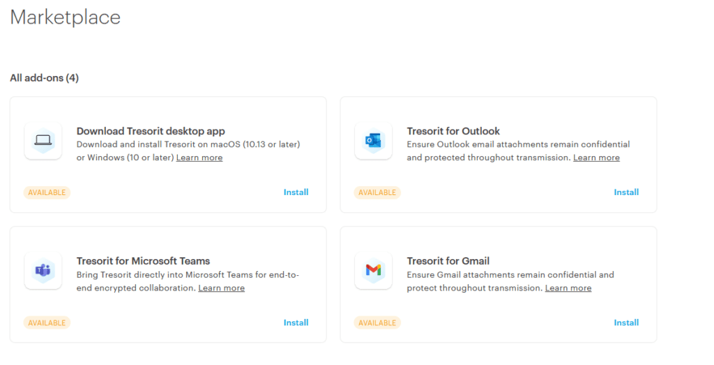 W zakładce Marketplace znajdziemy aplikacje, z którymi możemy zintegrować Tresorit. Przykładowo, integrując Tresorit z Gmailem, możemy tworzyć zaszyfrowane wiadomości e-mail, zastąpiając ryzykowne załączniki do wiadomości e-mail bezpiecznymi linkami.