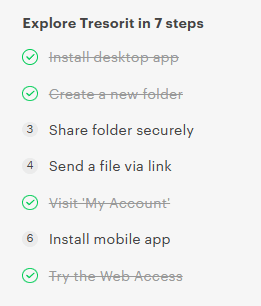 Tresorit jest podobny w obsłudze do innych popularnych dysków w chmurze. Dla osób, które mają jednak trudności z użytkowaniem aplikacji, Tresorit oferuje szybki proces wdrażania, która polega na wykonaniu 7 kroków.