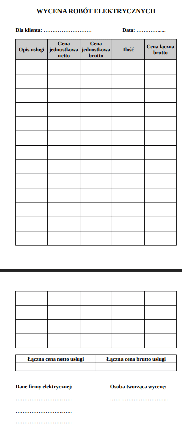KLIKNIJ TUTAJ, BY POBRAĆ TEN WZÓR WYCENY USŁUG ROBÓT ELEKTRYCZNYCH (.PDF)
