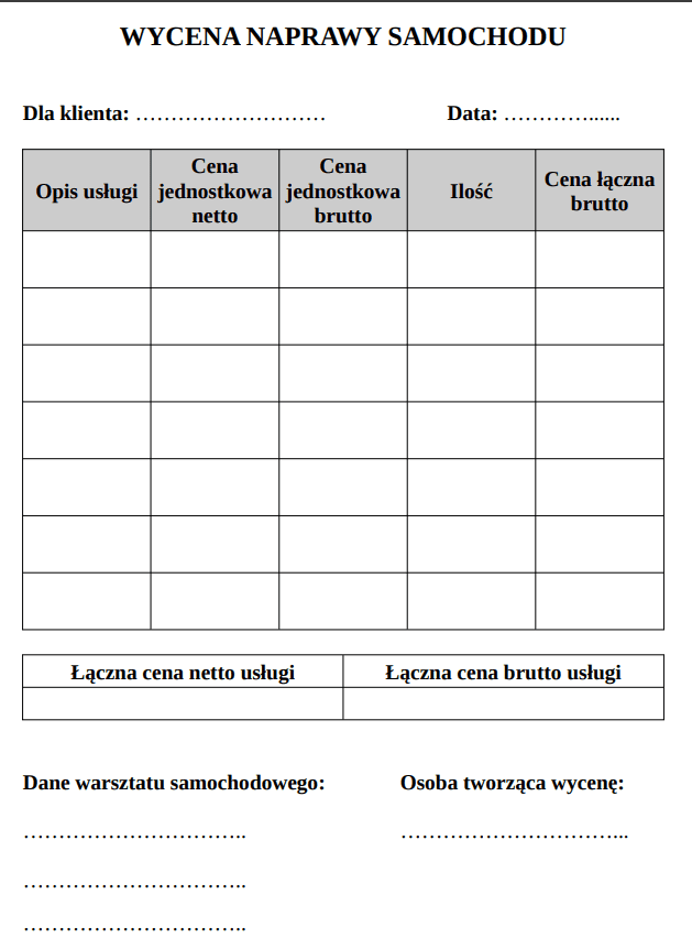 KLIKNIJ TUTAJ, BY POBRAĆ TEN WZÓR WYCENY USŁUG NAPRAWY SAMOCHODU (.PDF)